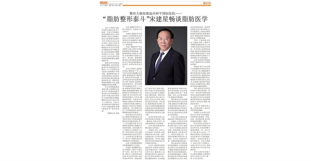 圖:溫州晚報(bào)獨(dú)家報(bào)道中國整形美容協(xié)會(huì)脂肪醫(yī)學(xué)分會(huì)會(huì)長、和平國際醫(yī)院副院長—宋建星教授。