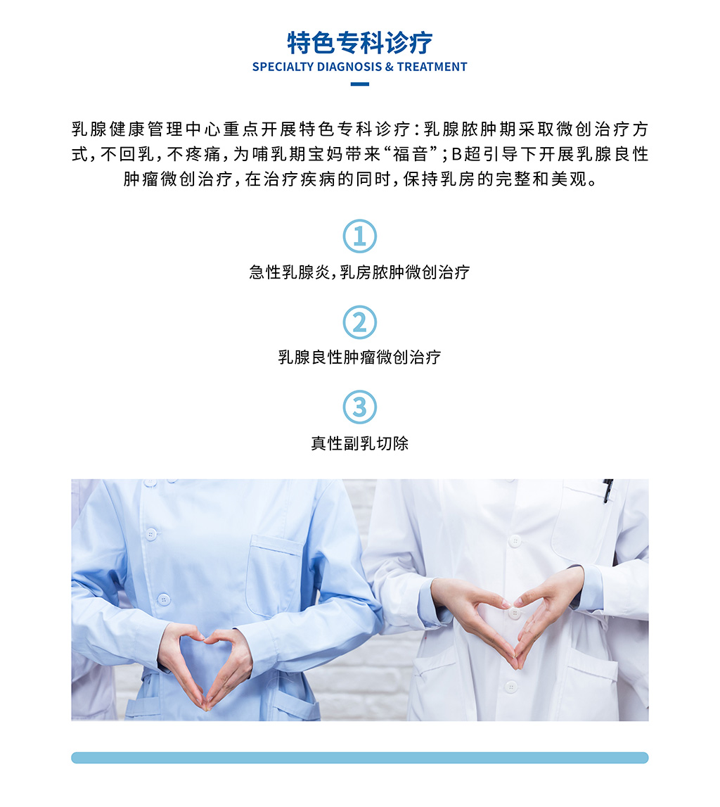 從女性乳房青春期發(fā)育異常,到成年常見的乳腺增生,到哺乳期好發(fā)的急性乳腺炎,到更年期好發(fā)的乳腺癌,對女性乳房健康的全生命周期健康管理。對乳腺疾病相關的學科,乳腺外科、整形美容科,婦科、內(nèi)分泌科,腫瘤科等相關學科進行深度融合。以科學診療,個性化診療為特色,為女性乳腺健康保駕護航。