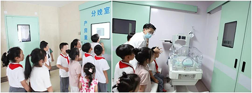 在分娩室門(mén)口,孩子們迫不及待了,沒(méi)等醫(yī)生開(kāi)門(mén)就不停地踮起腳尖往里看。進(jìn)入里面,周婷給大家講解了孕媽媽分娩后必不可少的輔助儀器,包括保暖臺(tái)、搶救臺(tái)等對(duì)新生寶寶至關(guān)重要的儀器。