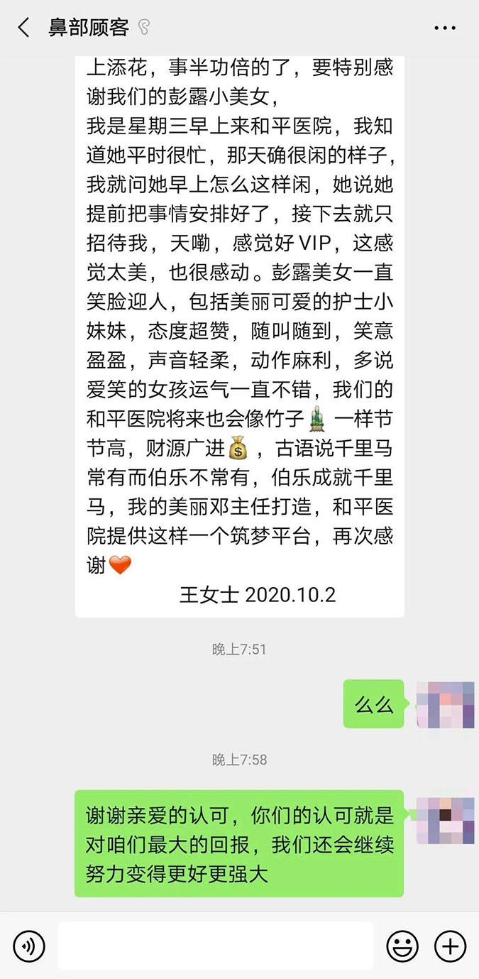 特別感謝鄧建平主任,醫(yī)術(shù)精湛,溝通語言有溫度,態(tài)度有柔度,讓我聽了很安心......細(xì)節(jié)決定成敗,鄧主任(做鼻子)的細(xì)節(jié)處理得恰到好處......每次過來查房,看到他的笑容,我就知道對我鼻子(的手術(shù)效果)他是滿意的。