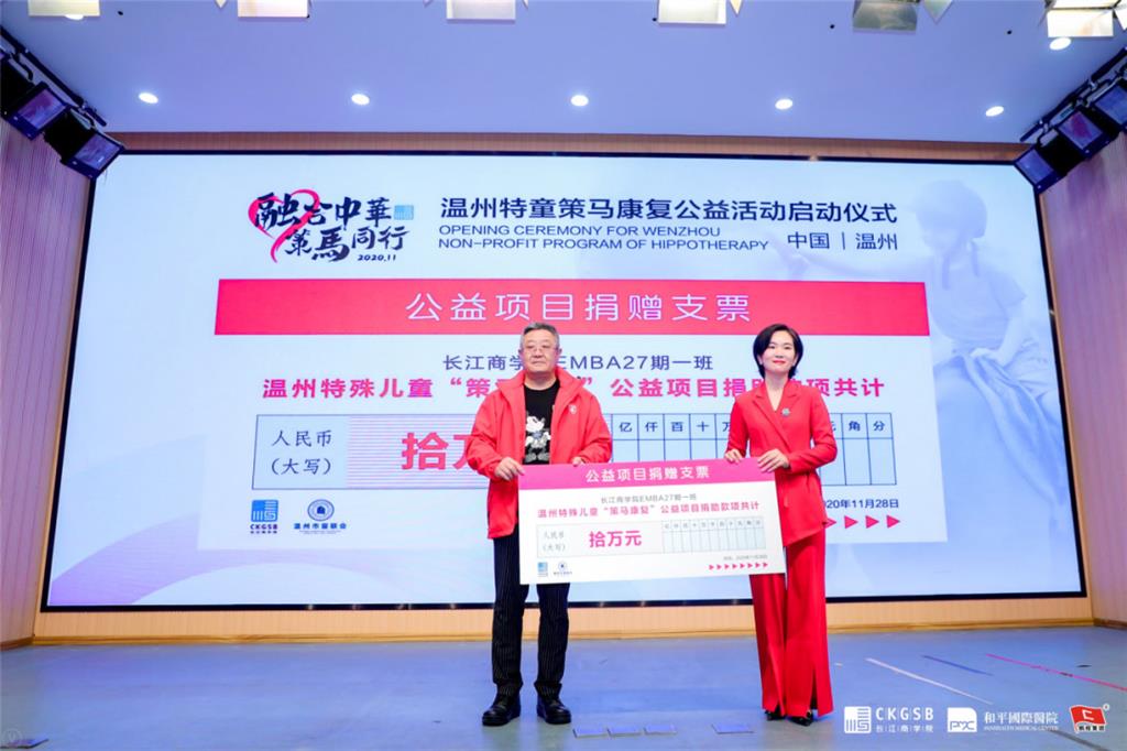 “無公益,不長江。”作為此次活動的首批愛心捐贈團體,長江商學院EMBA27期一班同學此次共為“策馬康復公益”項目捐贈10萬元愛心基金,由班級代表董非捐贈。