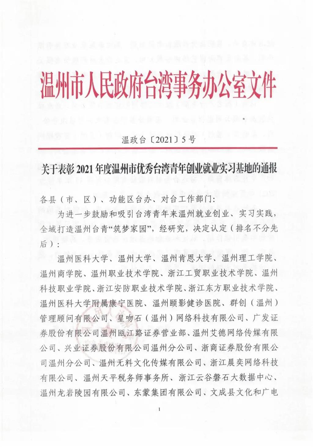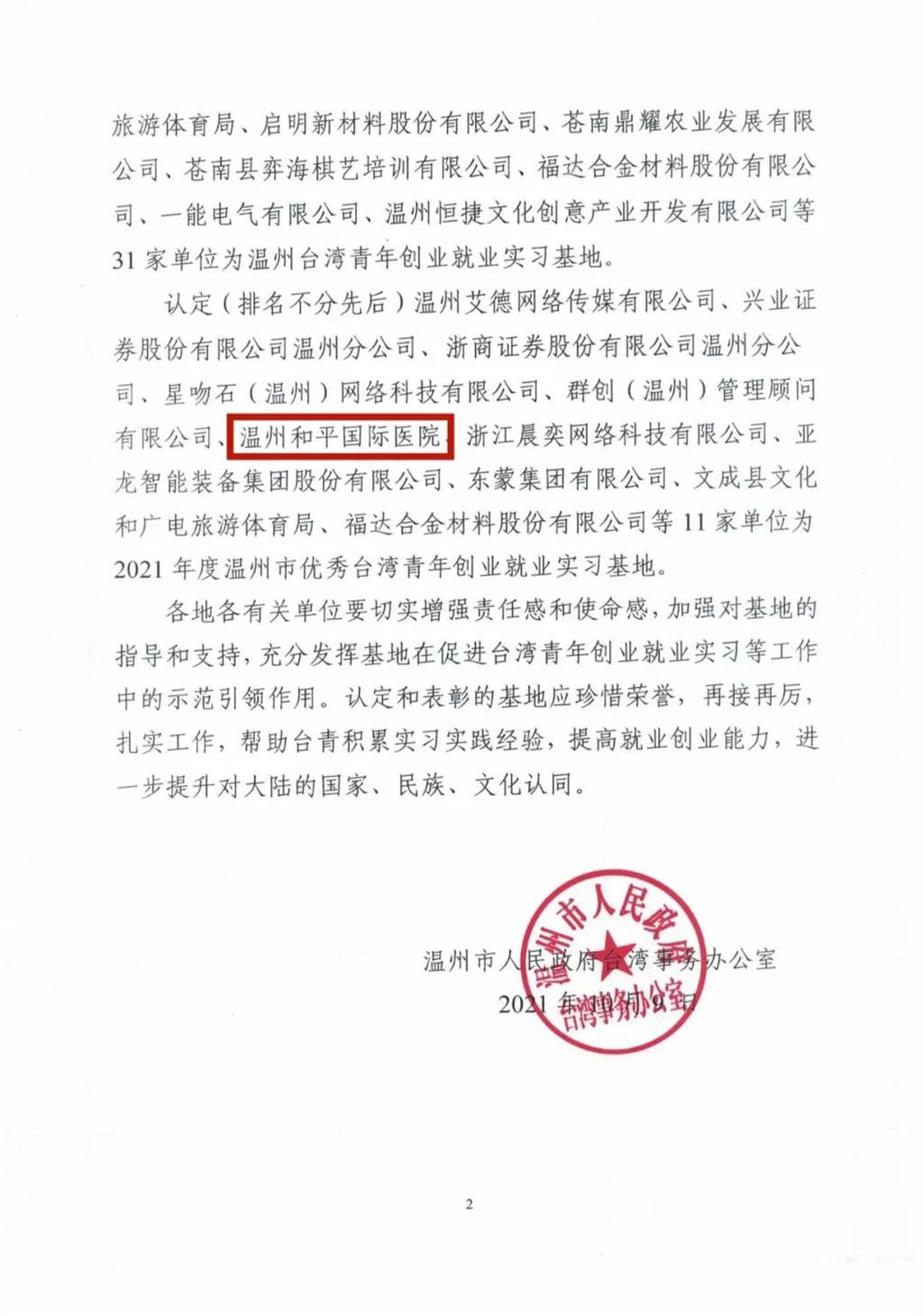 日前,溫州和平國際醫院榮獲“2021年度溫州市優秀臺灣青年創業就業實習基地”稱號。據悉,這已是和平國際醫院連續三年獲得該稱號。