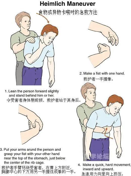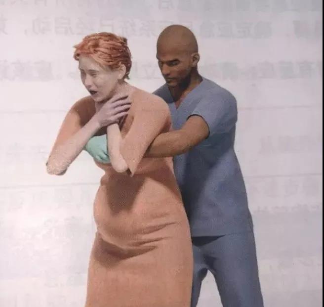 可采用上述用于成人4個步驟的②③④三點,或稍稍彎下腰去,靠在一固定的水平物體上(如桌子邊緣、椅背、扶手欄桿等),以物體邊緣壓迫上腹部,快速向上沖擊。重復(fù)之,直至異物排出。