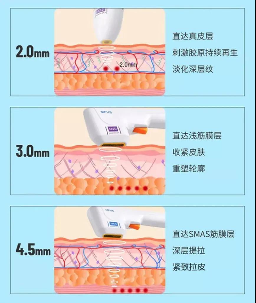 ① 半島超聲炮的治療頭有2.0mm、3.0mm、4.5mm三種深度,可以做到精準(zhǔn)的分層抗衰。并且,治療時(shí)無痛無創(chuàng)、安全舒適,治療后效果顯著、無停工期。② 4.5mm筋膜提拉 直達(dá)SMAS筋膜,懸吊提升下垂皮膚軟組織,提升輪廓;③ 3.0mm緊致,直達(dá)皮下淺筋膜層,緊致皮膚并有選擇性地減少脂肪細(xì)胞,緊致塑形;④ 2.0mm淡紋,直達(dá)真皮層,刺激膠原持續(xù)再生,淡化深層紋。如頸紋、額紋、魚尾紋等。部分素材來源網(wǎng)絡(luò)