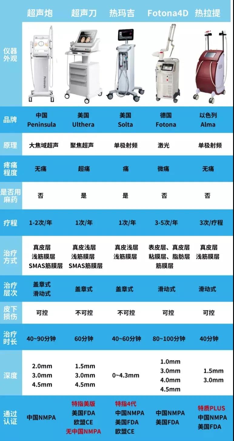 談不上“升級版”,超聲炮是國產(chǎn)半島家的儀器,而國內(nèi)一般說的超聲刀是指美版的超聲刀儀器。雖然同為“超聲”技術(shù),但同宗不同源。半島超聲炮是在傳統(tǒng)超聲刀的基礎(chǔ)上進(jìn)行了優(yōu)化升級,采用和過去不同的大焦域方式,讓能量不斷的累積,利用超聲波能量精準(zhǔn)加熱皮下SMAS 筋膜層、淺筋膜層、真皮層,熱能讓筋膜收緊,令老化的膠原蛋白收縮,并刺激膠原蛋白增生和重組,達(dá)到快速緊致皮膚,解決皮膚衰老導(dǎo)致的松、垂、皺紋等問題。體驗(yàn)感更加舒適,而且更安全,不會(huì)損傷目標(biāo)區(qū)域周圍的組織,所以才會(huì)通過NMPA的嚴(yán)格審核。兩種類型、三個(gè)深度的治療頭可以實(shí)現(xiàn)SMAS筋膜層、淺筋膜層、真皮層精準(zhǔn)的分層抗衰。