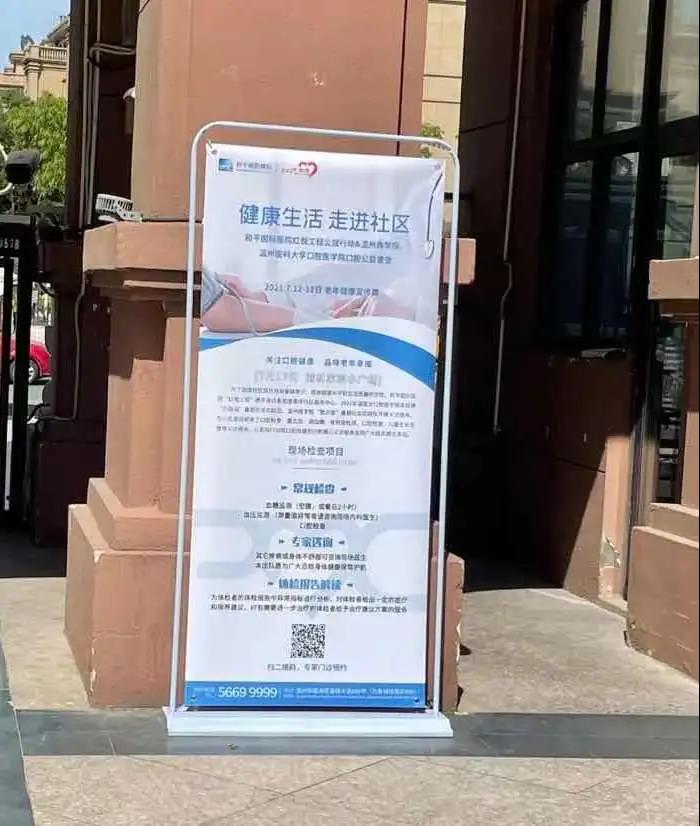 7月17日的義診活動主要服務對象,為前林家園和楠榕大廈小區的業主們,義診團隊為了更好的觸達服務對象,也為了能夠幫助到更多的問診者,于是在7月16日,便早早在義診地點擺放了“義診公告”的展架。