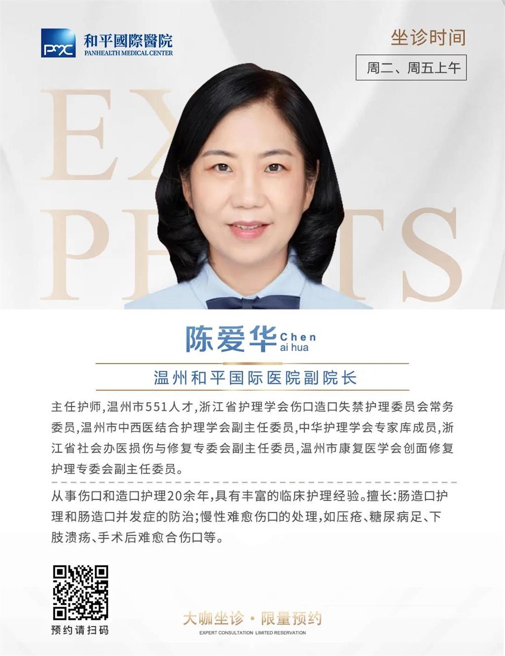 陳愛華傷口造口護理工作室是浙江省首家傷口造口護理工作室,對傷口、造口以及失禁患者提供規范化診療護理與咨詢,采用國際最先進的傷口濕性愈合理念,根據不同的傷口、造口、失禁,結合病人的全身情況,應用新型的傷口敷料,預防與處理各種傷口、造口、潰瘍、壓瘡以及失禁性皮炎等,減輕患者在治療過程中的疼痛和不適,加速傷口修復與愈合,縮短治療周期。