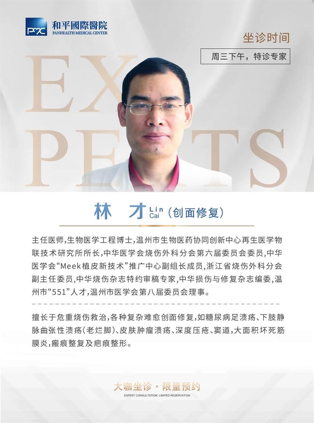 為了使廣大患者享受到更優質的醫療服務,滿足患者更高層次的診療需求,和平國際醫院開設了名醫館,特邀創面修復專家林才主任來院(每周三下午)定期坐診。