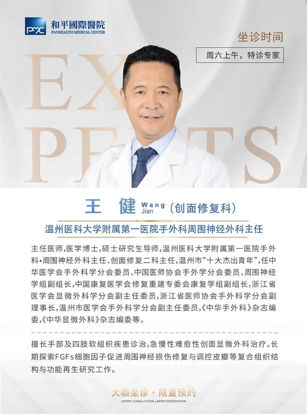 為了使廣大患者享受到更優(yōu)質(zhì)的醫(yī)療服務(wù),滿足患者更高層次的診療需求,和平國(guó)際醫(yī)院開(kāi)設(shè)了名醫(yī)館,特邀溫州醫(yī)科大學(xué)附屬第一醫(yī)院創(chuàng)面修復(fù)科主任醫(yī)師,醫(yī)學(xué)博士,碩士研究生導(dǎo)師王健來(lái)院定期坐診。